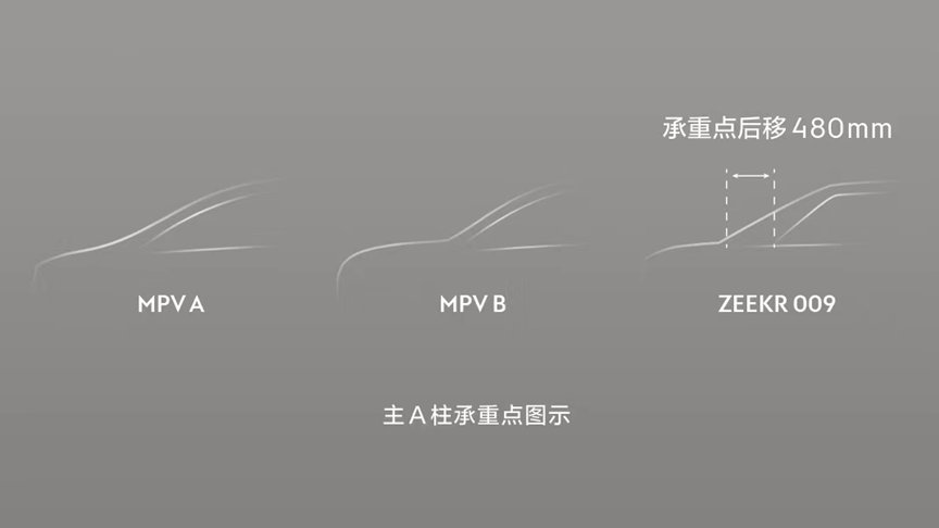 汽车的很多设计都是矛盾的,比如MPV的大空间需要更高的车身,风阻系数就难以保证。为了降低风阻系数,极氪009采用了超大的空气动力学静音风挡玻璃,倾斜角度很大,如果采用传统单A柱设计,会造成A柱倾斜角度太大,承重点太靠前,车头吸能和抗顶压能力都会很弱。