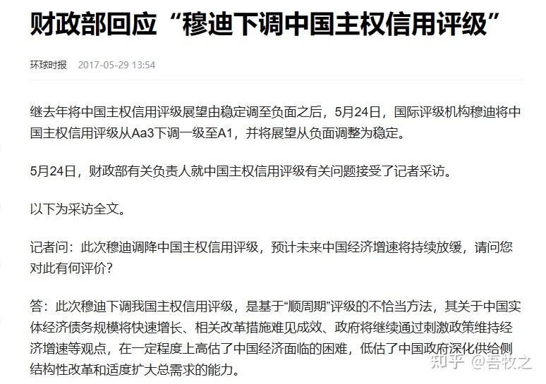 穆迪确实也曾经给中国主权信用评级Aa3评级过,但是2017年做过一个降级。