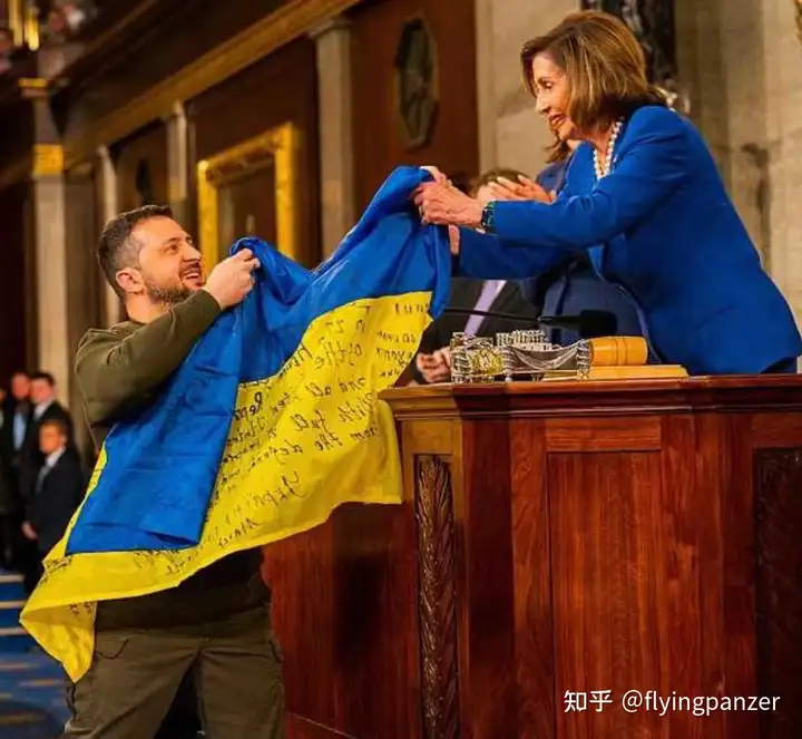 2022年12月泽连斯基在美国国会联系会议发表了一场“全球直播”的,让自由主义者们激动人心的演讲(LOL),这场演讲的高潮部分是泽连斯基将一面据说是Bakhumt(巴赫穆特)的乌克兰守军签名的国旗递给国会议长Nancy Pelosi。