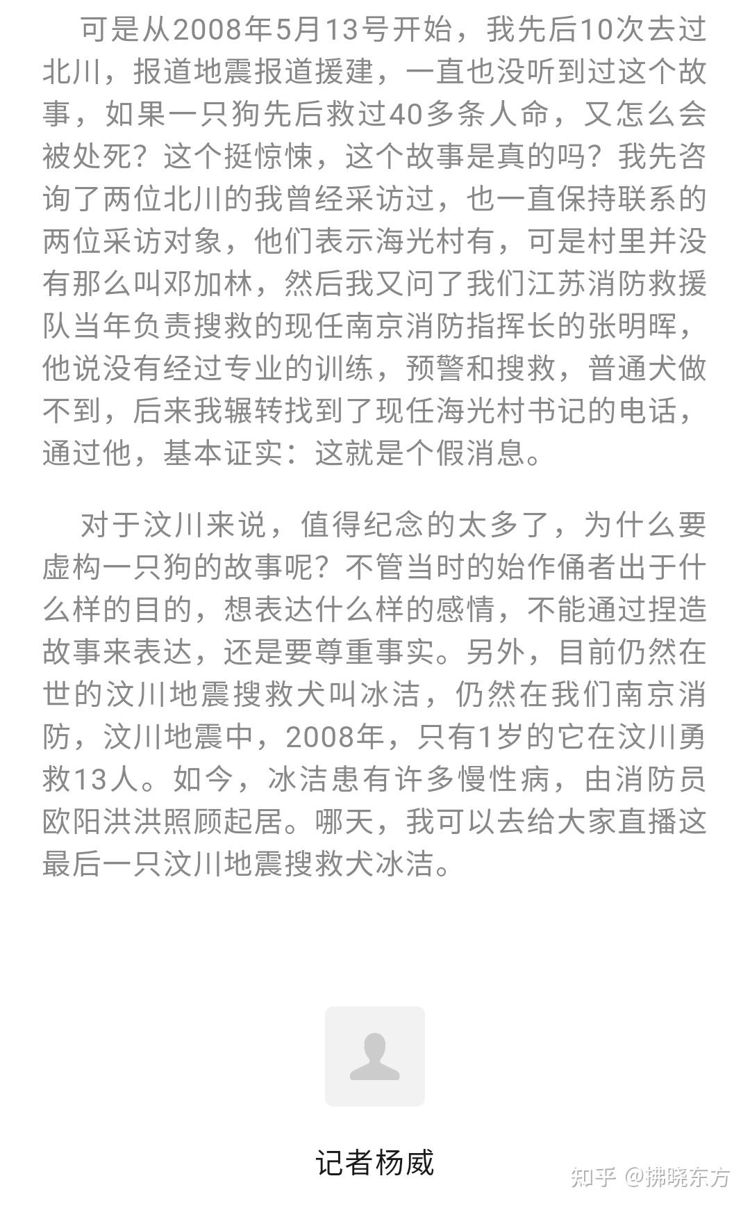 但是在部分爱狗人士眼里,看到的是,噢,原来没有搜救犬牺牲,造谣者太可恶了,欺骗了我的感情,浪费了我的眼泪。至于为什么要把人的功绩安在狗的身上,重要吗?