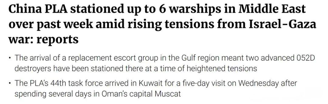 《报道称,由于以色列和加沙战争导致紧张局势升级,中国解放军过去一周在中东部署了多达 6 艘军舰》