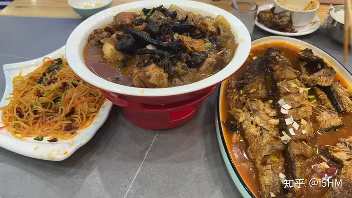 长白山二道白河景区,小笨鸡炖蘑菇、明太鱼、土豆丝,分量大到两人三顿吃不完,150元