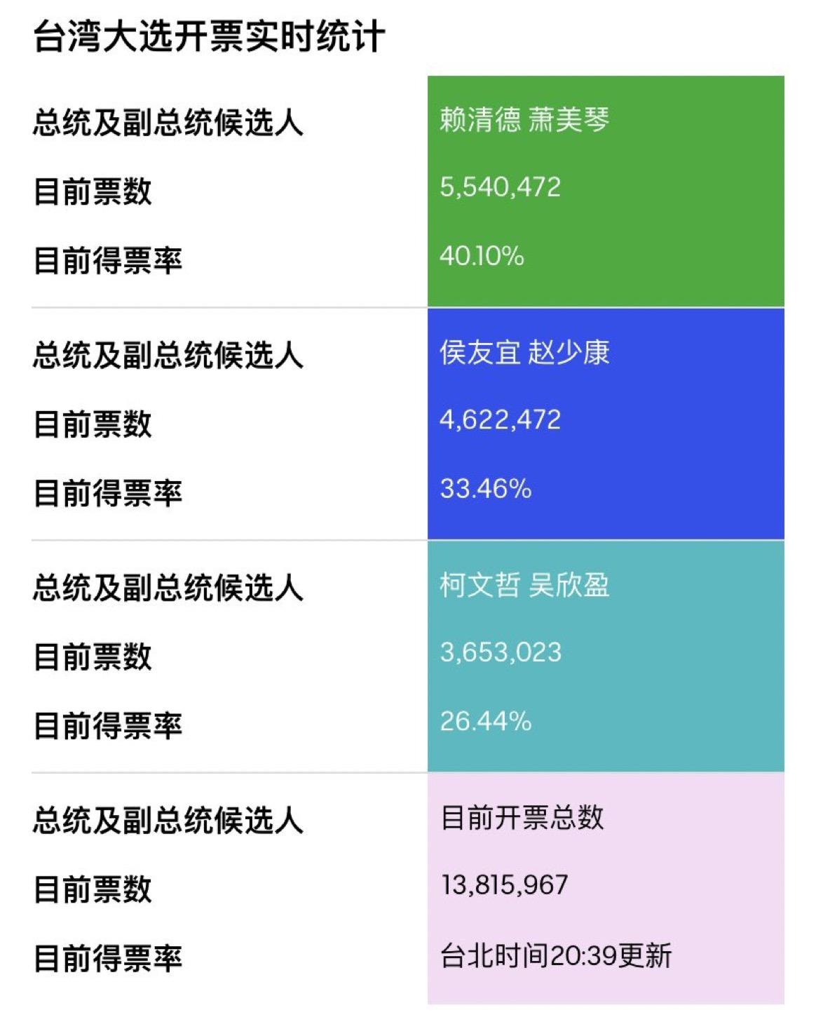 一共1381万参与投票,台湾选民差不多1900万左右,投票率73%,绿营得票率40%,相比较2020年蔡英文57.1%还算是有下降,但是事实证明,大部分台湾人还是支持民进党,所以说什么都是白扯,选民会用投票表达态度。 发布于 2024-01-13 22:41・IP 属地上海 赞同 111 条评论分享 收藏喜欢 收起