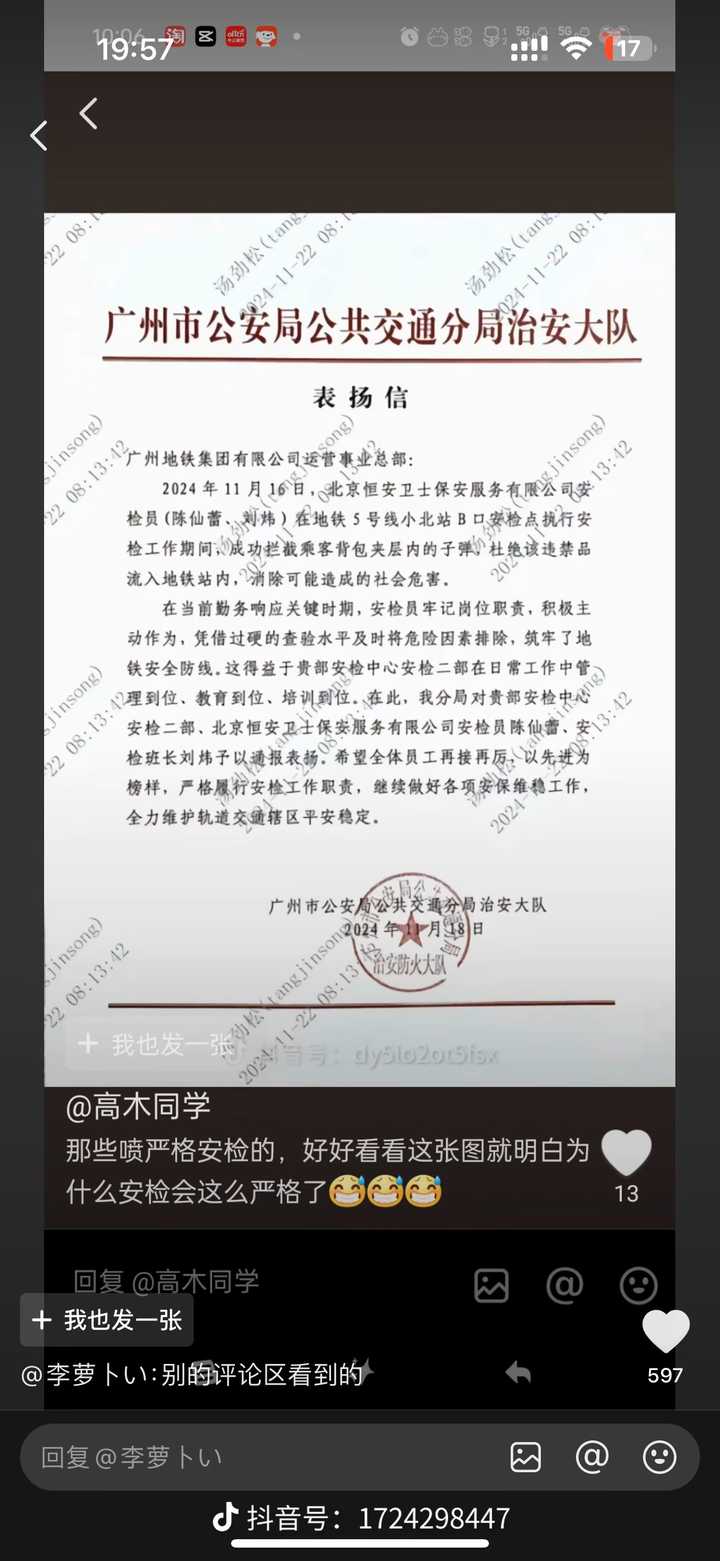 12月8日,广州地铁官方微博连续发布多条安检相关消息,表示为保障市民出行安全,进入地铁站“人过门,物过机”,携带物品均需过安检机。如通过安检门、安检机有提示报警...