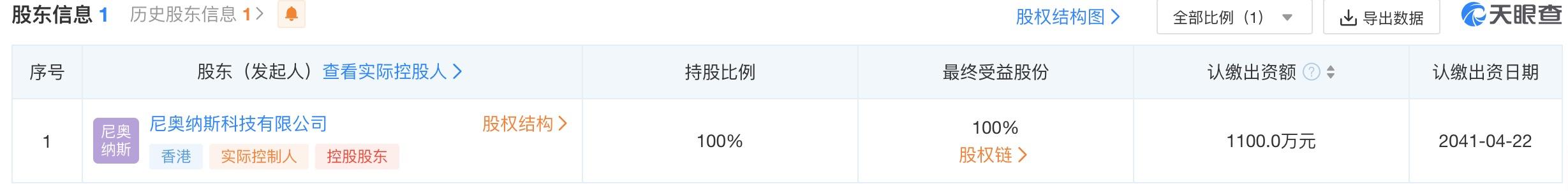 天眼查显示,该企业股东为尼奥纳斯科技有限公司,持有100%股权。