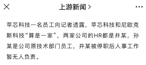 有媒体记者实地走访了尼欧克斯公司,旁边的苹芯科技的员工透露,苹芯科技和尼欧克斯科技“算是一家”。