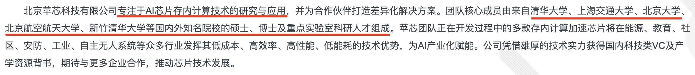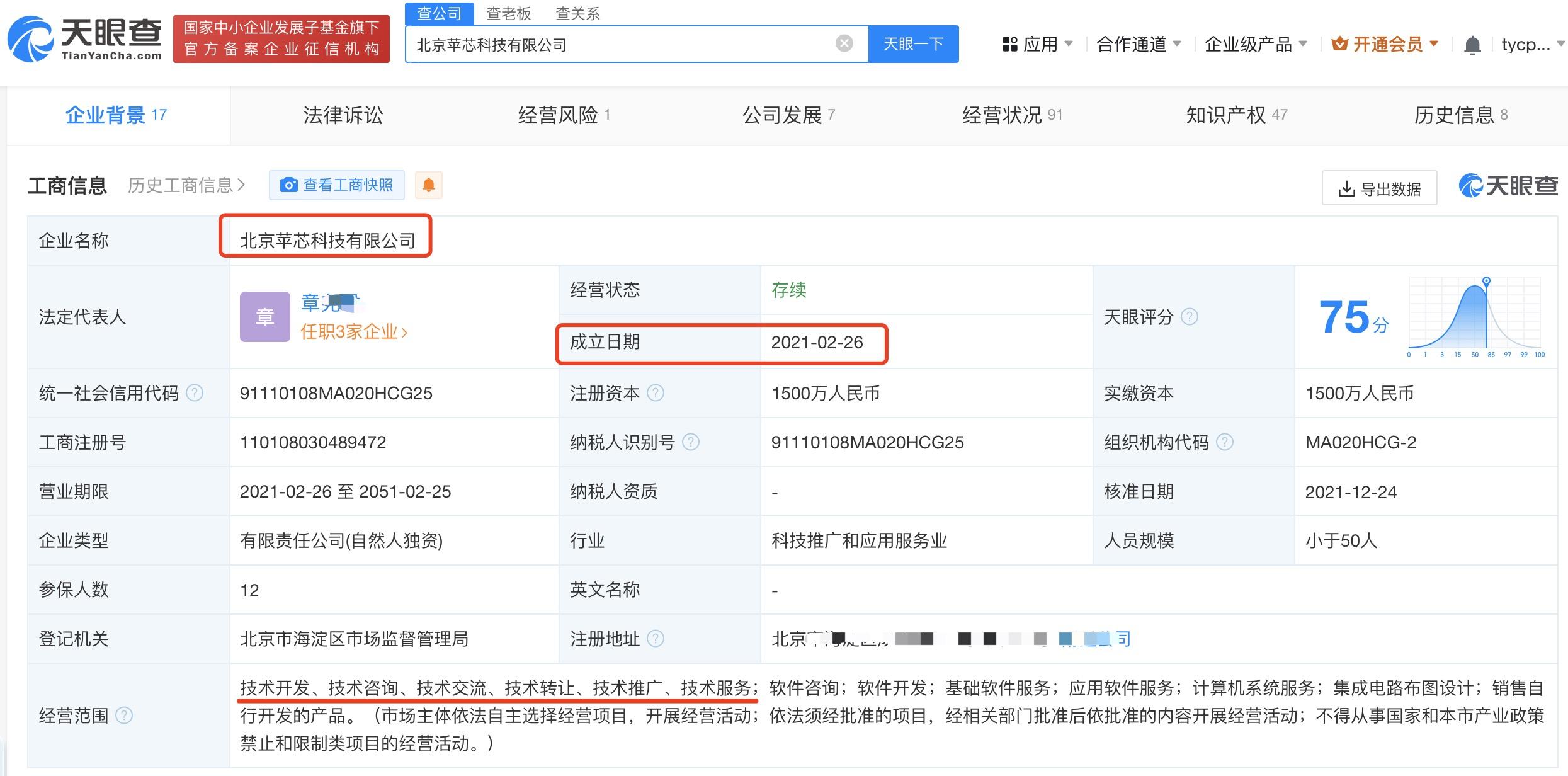 而北京苹芯科技有限公司为一家AI芯片研发商,成立时间为2021年2月。