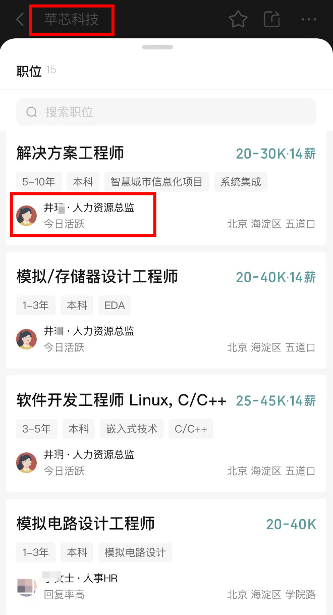 天眼妹在招聘软件上看到,苹芯科技目前共有15个在招岗位,井某负责招聘的岗位有10个,被公司开除的当天(1月8日),井某的招聘动态显示,其“今日活跃”。