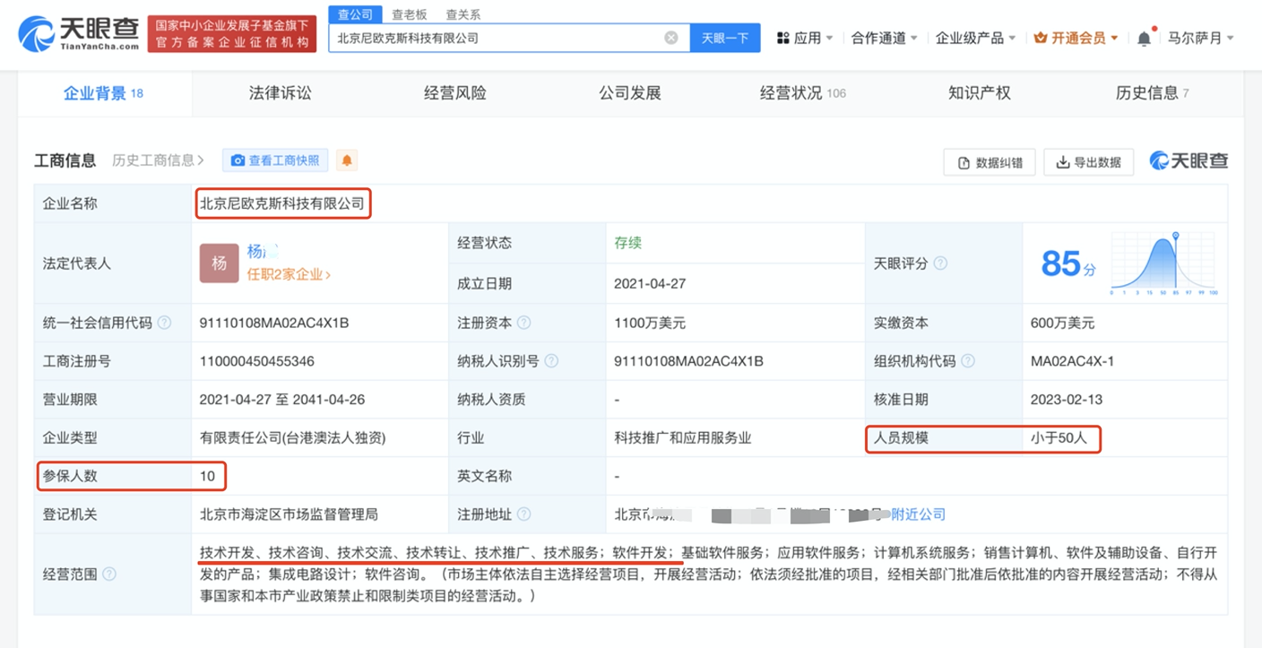 天眼查App显示,北京尼欧克斯科技有限公司成立于2021年4月,法定代表人为杨某,注册资本1100万美元,经营范围含软件开发、计算机系统服务、集成电路设计等。