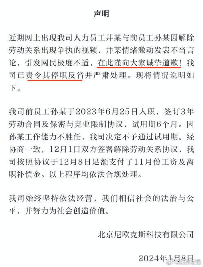 1月8日凌晨,涉事公司北京尼欧克斯科技有限公司发声明称,网上出现人力与前员工因解除劳动关系出现争执的视频,其中人力员工情绪激动发表不当言论,对此诚挚道歉。