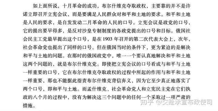 如上面所说,十月革命的成功,布尔什维克夺取政权,主要靠的并不是许诺立即召开立宪会议,而是要满足人民群众对和平和土地的要求。和平和土地是人民的要求,是自发动二月革命的人民的口号。立宪会议是政党的口号,它的提出要早得多,是反对沙皇专制制度的各政党提出的口号和目标。俄国社会民主工党最早提出这个口号,是在1903年召开的第二次代表大会上,次年,社会革命党也提出了同样的口号。但在俄国当时的条件下,更为紧迫的是解决和平与土地的问题。在那时的俄国政党中,唯一一个要认真地解决和平和土地这两个问题的,就是布尔什维克。即使把立宪会议的口号看成与和平与土地一样重要的口号,它在布尔什维克夺取政权的过程中所起的作用与和平与土地一样重要,那也不能据此指责布尔什维克背信弃义,因为它至少真正地落实了这两个口号,即和平与土地。而孟什维克、社会革命党人和立宪民主党在它们执政的八个月的过程中,没有为解决这三个问题中的任何一个采取过一项严肃的措施。