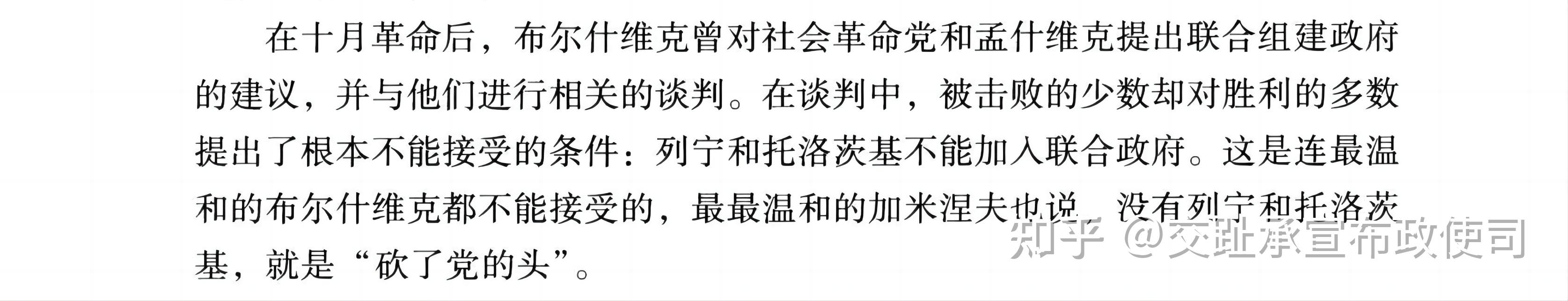 在十月革命后,布尔什维克曾对社会革命党和孟什维克提出联合组建政府的建议,并与他们进行相关的谈判。在谈判中,被击败的少数却对胜利的多数提出了根本不能接受的条件:列宁和托洛茨基不能加入联合政府。这是连最温和的布尔什维克都不能接受的,最最温和的加米涅夫也说,没有列宁和托洛茨基,就是“砍了党的头”。
