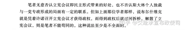 笔者无意否认立宪会议即民主形式带来的好处,也不否认斯大林个人独裁与一党专政形成的局面有一定的联系。但如上面那位学者那样,说布尔什维克就是凭着许诺召开立宪会议才获得政权,而得到政权后就过河拆桥,解散了立宪会议,则是笔者不能苟同的,这种说法至少是不全面的。