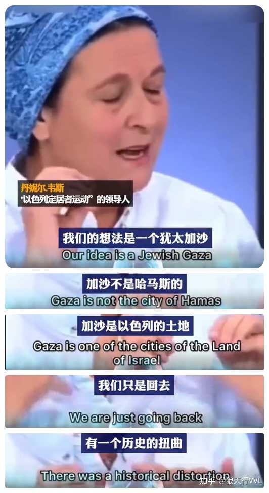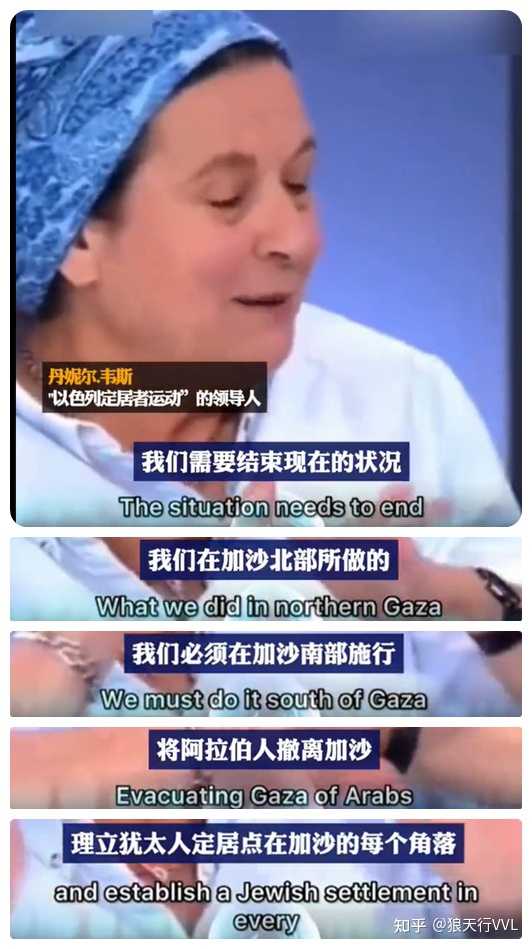 以色列极右翼政治团体,“以色列定居者运动”领导热,丹妮尔·韦斯最近公然表示:我们要把加沙当地阿拉伯人都赶走,要建立一个“犹太加沙”,其中重要理由之一是“想看到海”,而且“为了不遮挡视线”,必须“把房子推平”!