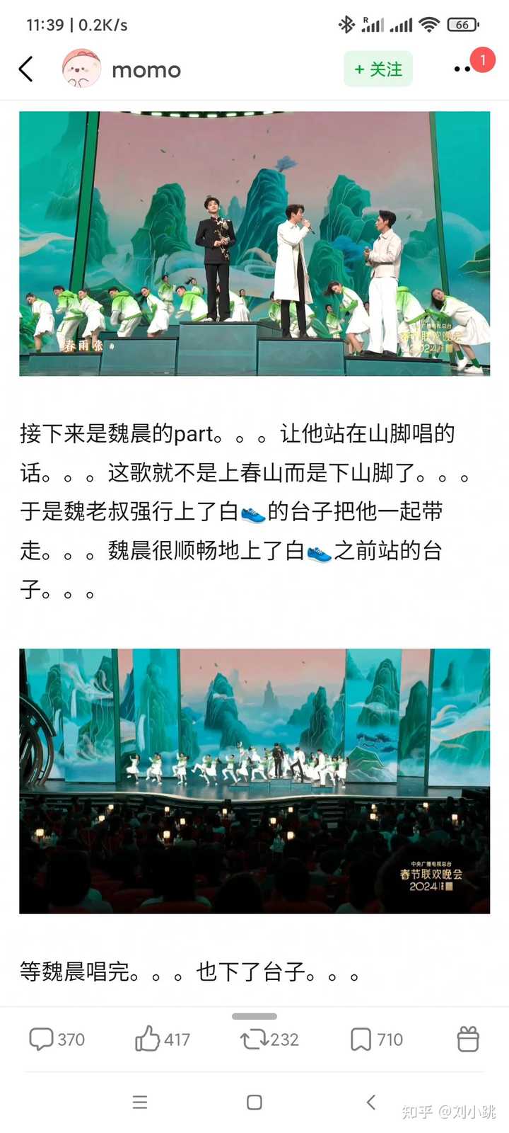 ,魏晨也是装作镇定。等魏晨来中央的时候,这俩又下去了,说实话整个画面非常混乱。首先是台阶上就魏晨一个人,这不好看。其次是白和魏大勋两人走也没走出感觉,像是急匆匆撤了。然后,后面的伴舞和这三完全不在一个情况中,他们越整齐,显得前面越混乱。等魏晨唱完就开始混乱地左右拜年,这也很不合常理。。。因为他们三个看着非常赶,但是春晚这种舞台,排练过这么多遍,几乎不会存在歌舞节目很赶的情况,那只有可能是舞台上出了问题。
