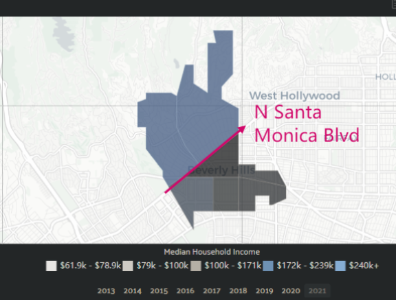我们可以看到比弗利地区被N Santa Monica Blvd这条街分成了贫富两个区,