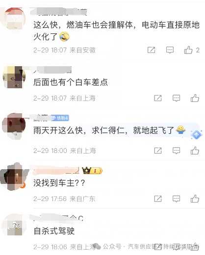 对于这起事故,也引来了不少网友的讨论。有网友评论表示:触目惊心,安全第一。雨天飙车,真有不要命的。还有网友评论表示,这么快,燃油车也会撞解体,电动车更别说了。此外,还有网友针对车辆碰撞后起火的情况评论表示,发生碰撞后,电池组受到挤压肯定会被燃的。