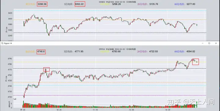 这几天权重出现持续拉升,特别是前两天提到的上证50,中小票调整围绕昨日均价和5日价运动开盘上证50回调双重均价2306后快速拉升,全天一路走高,今天权重走势跟随金融,中证金融10点反弹5日均价后回调至昨日均价4746后继续震荡上行,14:30分突破5日价于10价遇阻,收于10日价附近;中小票代表中证1000开盘低开,反弹昨日均价附近后两次回调5日价5350,全天并未有效突破昨日均价5396,尾盘止跌于5日价,收于昨日均价和5日价中间。