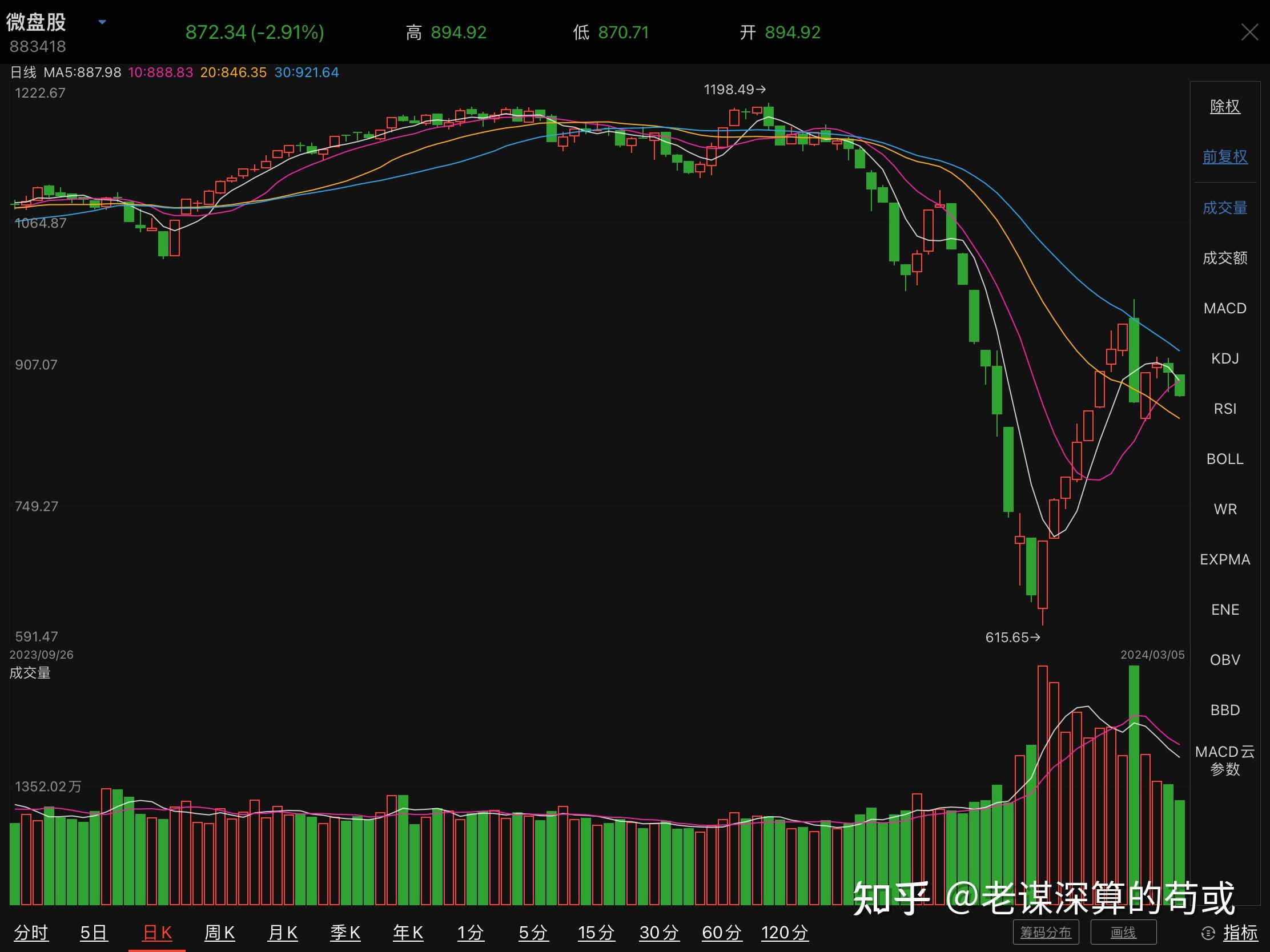 对比沪深300和微盘股指数可以发现,沪深300非常强势,而微盘股已经出现均线死叉。说明今天的盘面有一定诱多的嫌疑。