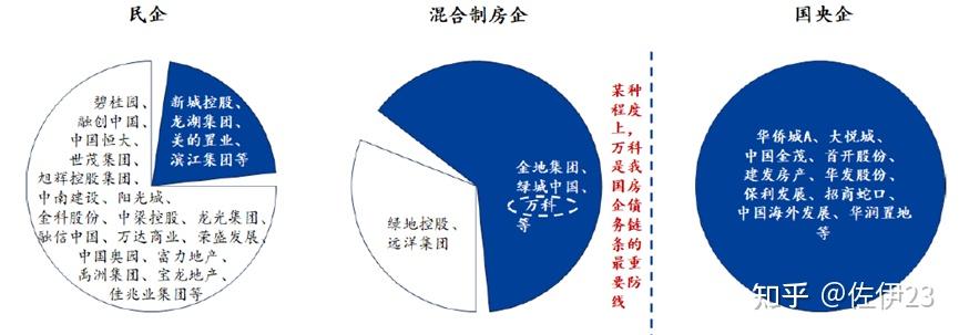 2023年以来,混合所有制的开发商也频频爆出负面舆情。前段时间,金地要出事的消息也是到处乱传。看下面这个图,白色是已经出事的,蓝色是还没出事的。