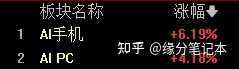 盘面上看,AI仍是当前的主线。“AI手机”今日继续占据板块涨幅第一位,“AI PC”紧随其后。