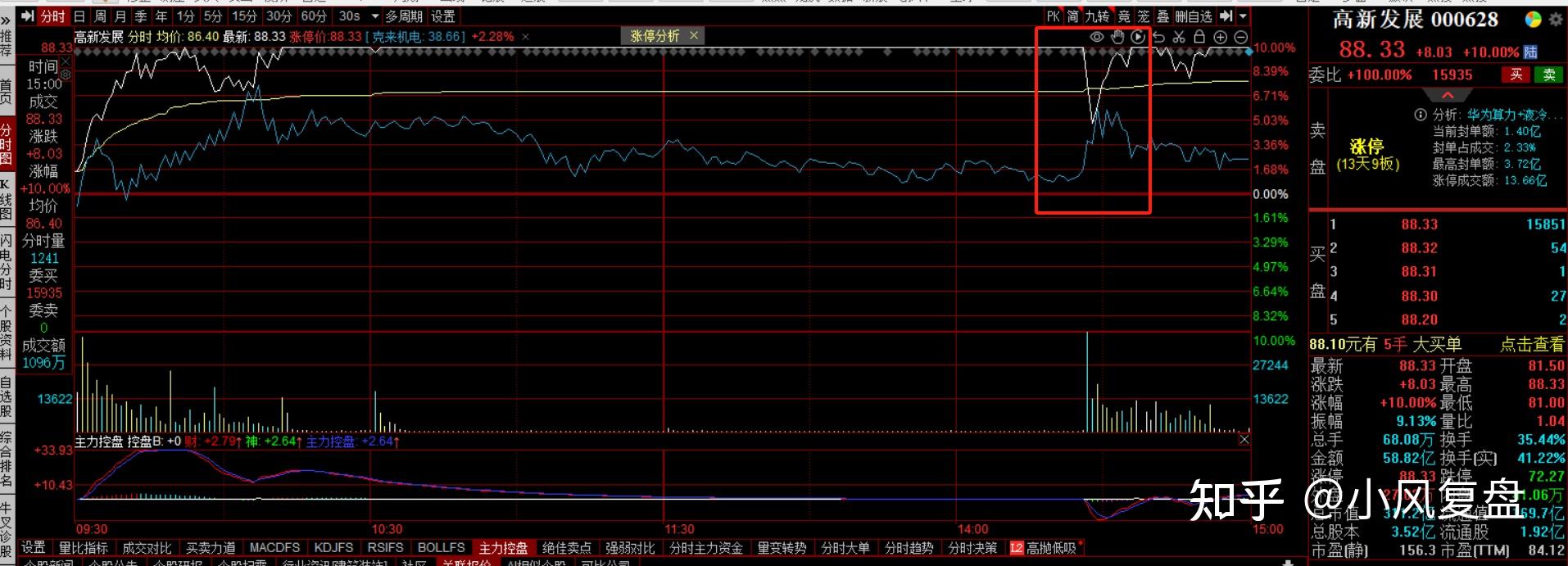 (1)高新发展:竞价成交量没有昨天高,开盘之后继续高举高打,稳定场内筹码情绪,早盘封板的时候还是缩量的,但是伴随其它大票的冲高回落,它尾盘也出现了强烈分歧。在趋势大票整体分歧的情况下,高新发展想独善其身还是很难的,明天多空博弈估计会非常激烈。如果没有底仓的话还是很难参与的,可以等回调几天,参与它的第2波,参考当年的省广集团。