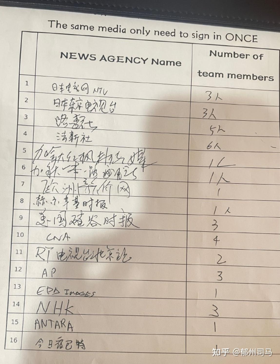 注:现场签字表,看看各家记者的字迹。。