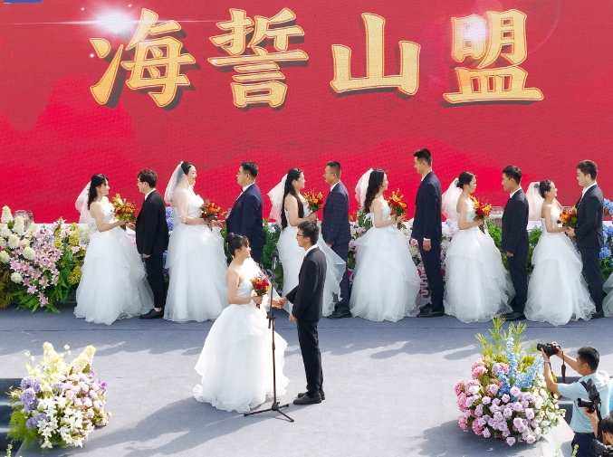新人们在山东青岛金沙滩啤酒城“爱情海湾”参加集体婚礼 图片来源:新华社 三是各地积极施行优化生育政策,也会对提振育龄群众的生育意愿产生一定的积极效果。