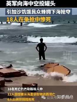 3月25日,据封面新闻报道,英国用A400M运输机首次向加沙空投了10余吨粮食援助,但是却被曝出,其中含有大量臭鱼罐头,结果造成18人在争抢中惨死,其中12人因为想从海里获得物资而溺亡,6人因为拥挤踩踏而亡。