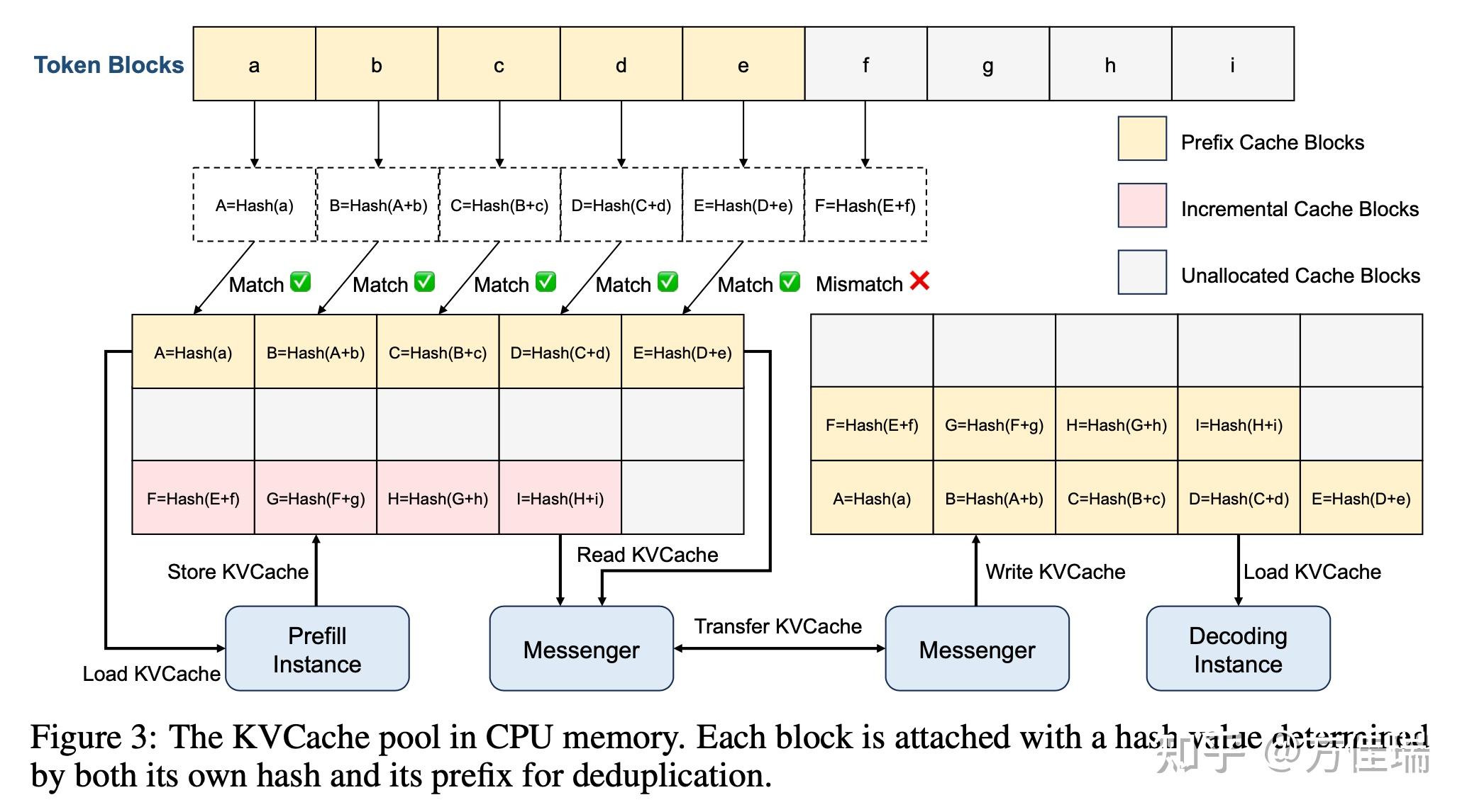 我们跟随论文的安排,跟Figure 4先走马观花过一遍Mooncake处理一个request的流程。一个request到达(tokenized之后的),调度程序会选择一对Prefill Instance和Decode Instance,模型参数要在两个Instance都有副本,并启动包含四个步骤的工作流程: