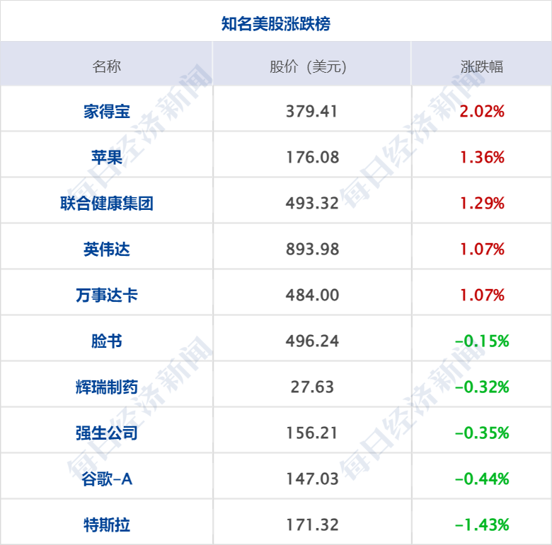 美股三大指数集体收涨,道指涨320点,涨幅0.83%,标普500指数涨0.56%,纳指涨0.39%。其中,标普500指数再创历史收盘新高。大型科技股涨跌不一,苹果涨超1%,英伟达跌近4%后转涨超1%,奈飞、亚马逊、微软小幅上涨;英特尔、特斯拉跌超1%,Meta、谷歌小幅下跌。中概股多数下跌,纳斯达克中国金龙指数跌0.59%。蔚来跌超6%,微博、理想汽车、京东跌1%左右,拼多多、富途控股、百度、爱奇艺、网易、哔哩哔哩、阿里巴巴、满帮、唯品会小幅下跌。腾讯音乐涨超6%,小鹏汽车小幅上涨。