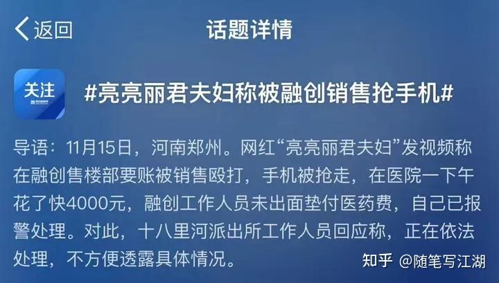 只是2万块佣金,还不是烂尾楼的购房款。小夫妻正常维权,融创工作人员竟然无视法规,肆意殴打两人,还抢夺两人私有财产。
