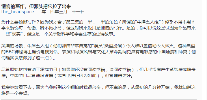 叶文洁这一原著中重要的角色塑造失败,一脸仇大苦深的死鱼眼,难道西方表现仇恨的手法都是这种二傻子表情吗?高等知识分子都是这样的?我怎么没看见西方哈姆雷特这么拍?