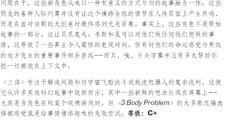 连我这个原著观众都没有搞懂,剧情一下子跳跃到第二把游戏就解出了三体问题,拜托你们连这个世界的规则(或者表象都没搞出来)都没展现给观众看,一步登天