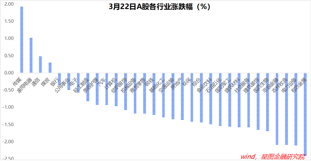 行业层面,传媒(1.93%)、家用电器(1.03%)、通信、煤炭逆势收涨;有色金属(-2.42%)、电力设备(-2.1%)、农林牧渔、非银金融、医药生物等领跌。