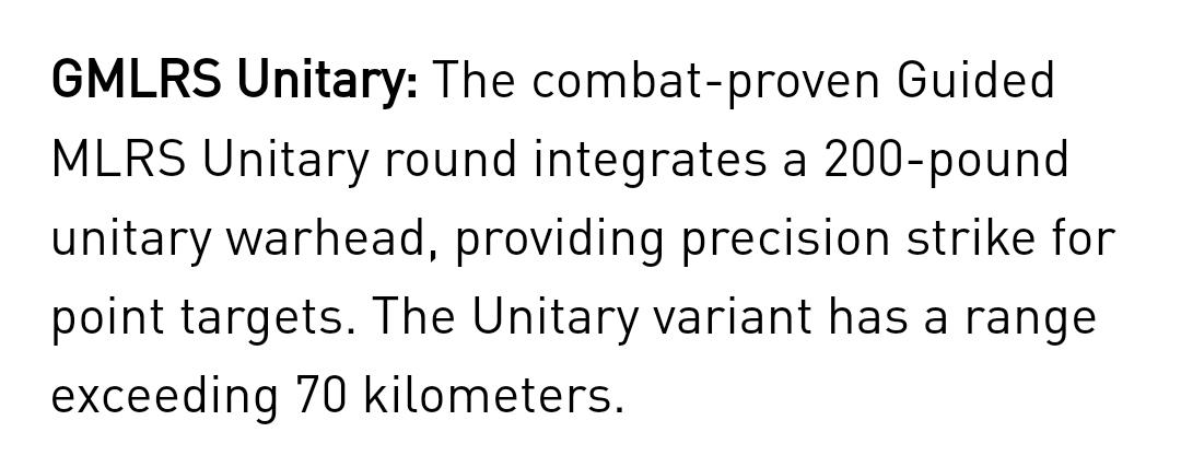 GMLRS就是在赫尔松把俄军炸得灰头土脸最后被迫撤回第聂伯对岸的那款弹药,是目前MLRS/HIMARS弹药库中最低端的弹药,再往上就是300km级别的ATACM了。