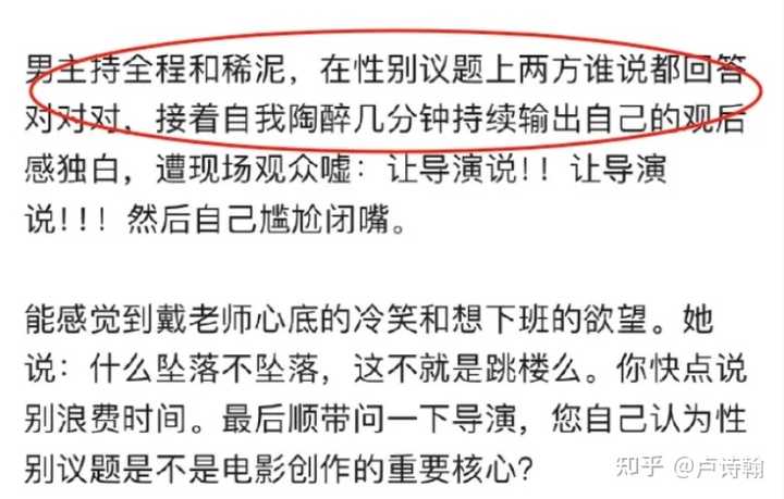 明明导演在各个地方都表示过这是一部女性主义电影,而且是以自己女性的视角构思、创作出的这样一部作品。结果,董教授听不见,听不见,就是听不见。而且导演发表言论的时候,他在偷偷拍照。