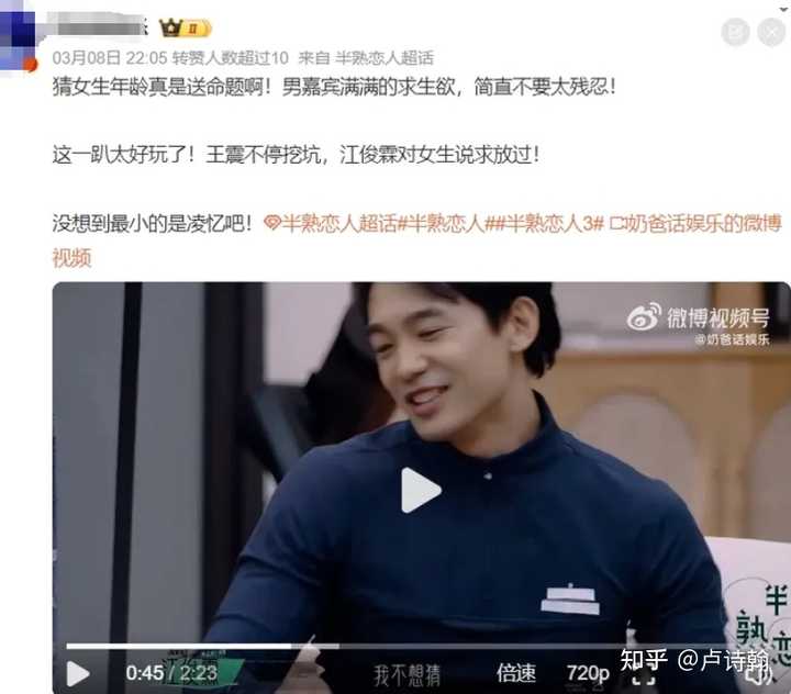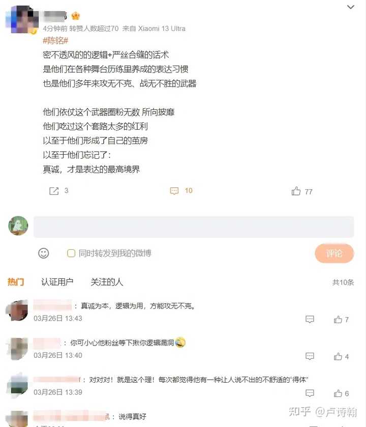 陈铭:我一定要都说话多搞节目效果,这样才显得我性价比高,节目组下次肯定还邀请我嘻嘻。然后2000字发言,插科打诨,来点幽默,捕捉到戴老师和董老师的观点矛盾然后在那煽火,表达自己对夫妻关系的理解,说了一大堆奇葩说里那种“看似传播的过程中有一些生命丧失了,但有某些新的语义添加到其中,没有改变任何一个词或者一个内容,看似客观的记录真的能抵达过去吗,这是我对电影的一个感受,然后后来又说了一堆....”