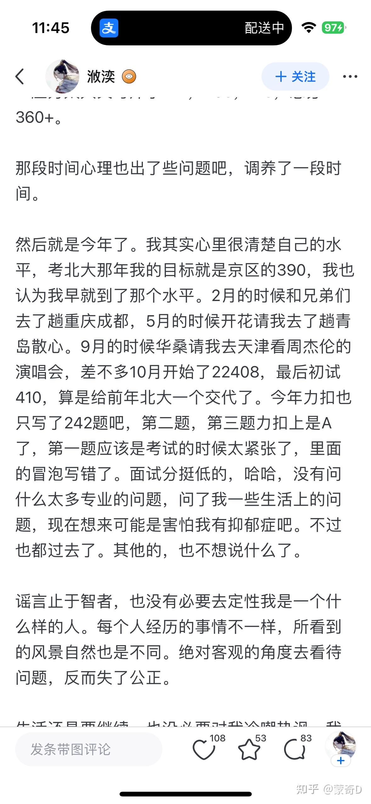 别在这推理了,410的那位老哥已经发文回应了啊,因为面试表现不是很好,不过确实太可惜了,还是想说一句,选择远大于努力。410分,去哪个22408不是闭眼上,唉,他还是四战,数学考了144已经非常不错了,希望他越来越好吧。