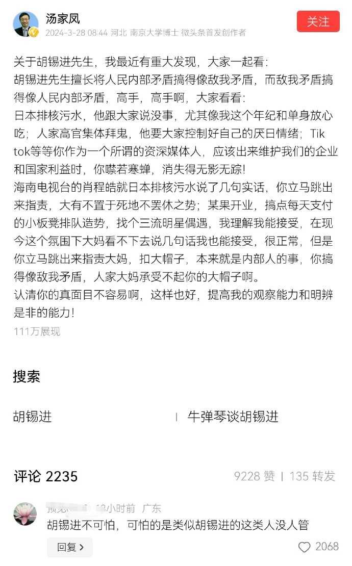 胡锡进在“连初中阅读理解都读不懂”和“罕见精日”两种侮辱中选择了后者。毕竟胡锡进是个文人,比被骂政治立场更不能忍受的是对文学素养的自贬。