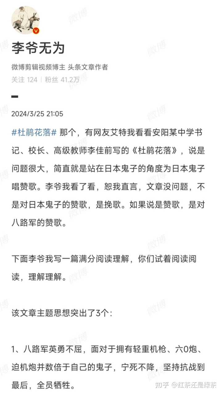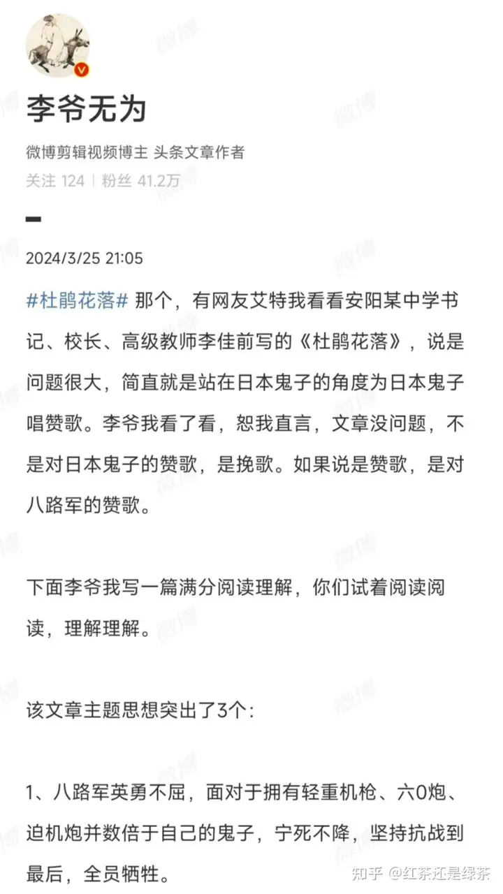 《杜鹃花落》这个的原文我看了一下。从我个人的阅读体验来说,我并不认为这个小说的作者是在刻意抹黑和侮辱八路军,也并非是故意在为日军张目。然而,“低级红等于高级黑”,这个小说能引发现在如此大的反应,作者别人倒也并不冤枉——因为客观上这个小说的确起到了“抹黑”的效果。