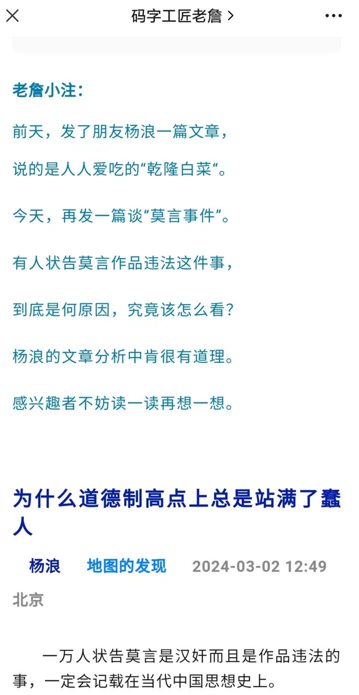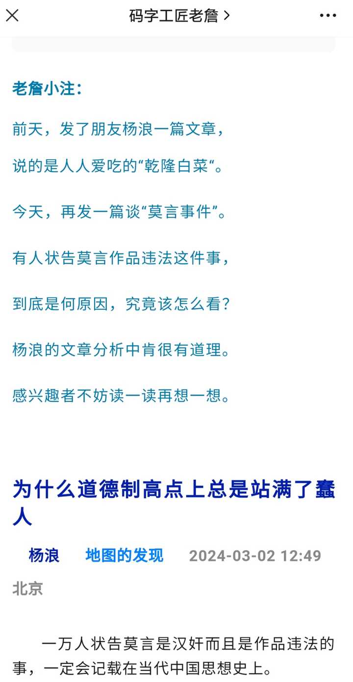 所以他批举报南京商场促销贴画的行为,也会挺莫言。这次发文为《杜鹃花落》申辩并不奇怪。