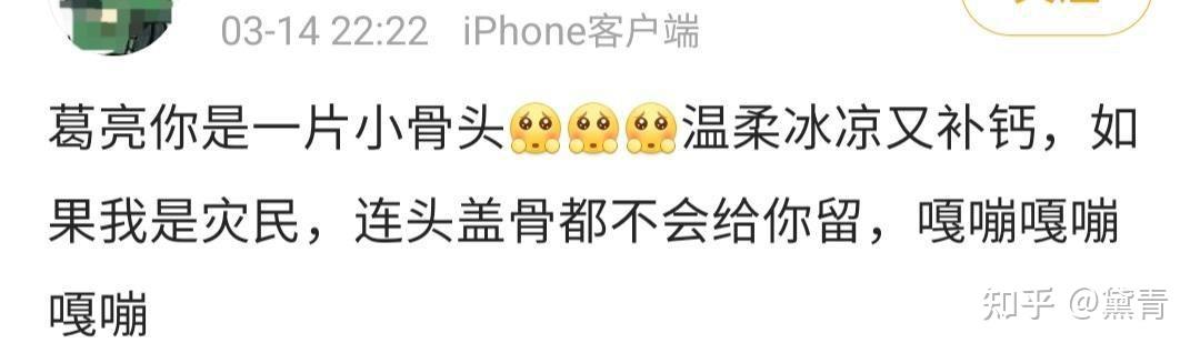 还有诸葛武侯,我就想问到底是什么样的三观写的出诸葛亮八岁被分食啊?编剧你一定不是四川人吧?历史怎么学的?你不会学的盗版历史还学的历史虚无主义吧?诸葛亮被分食这个剧情放在三国以后任意一个年代都是很炸裂的程度。为什么诸葛武侯会被立祠被川蜀人民铭记至今?写不出高尚的灵魂就写以极端方式硬核成神是吧?