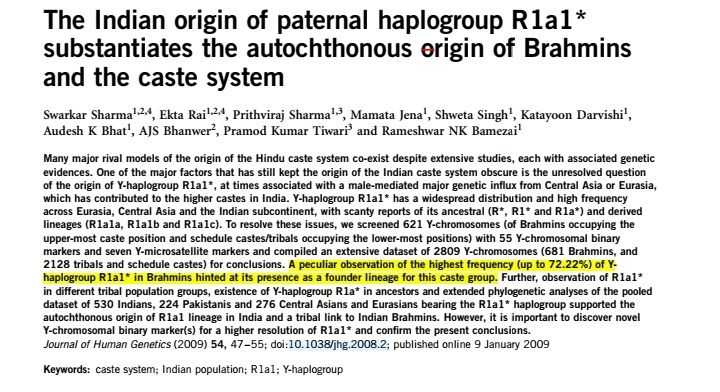 印度婆罗门中整体占比最高的父系是R1a、占比第二的父系是J2,尽管占比低了不少,在印度西北部的古吉拉特邦婆罗门中有较高的G父系。