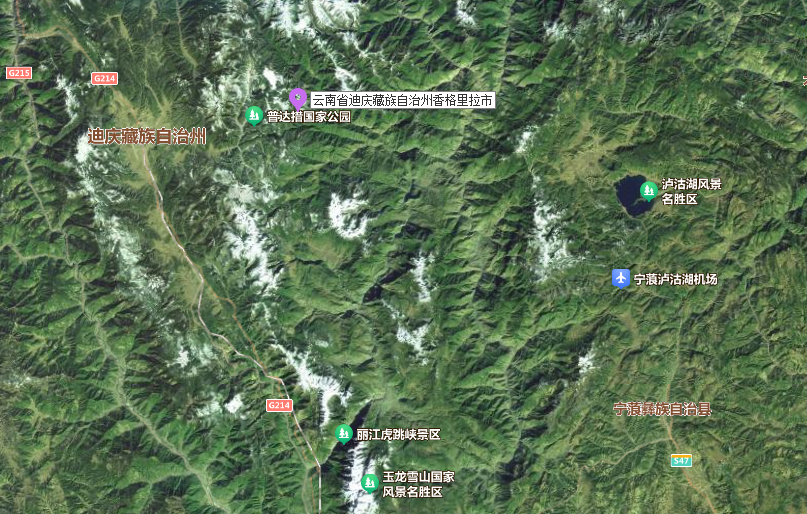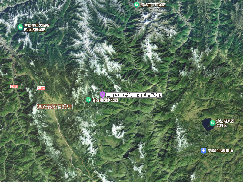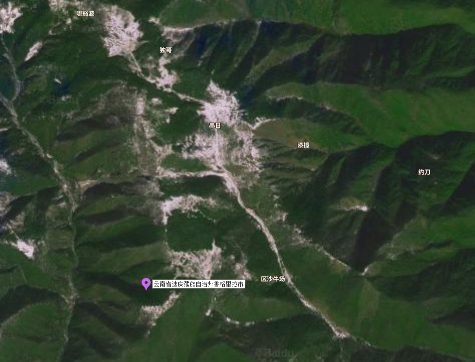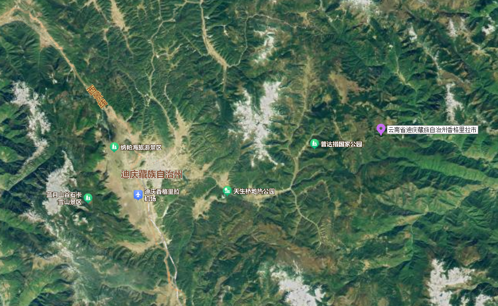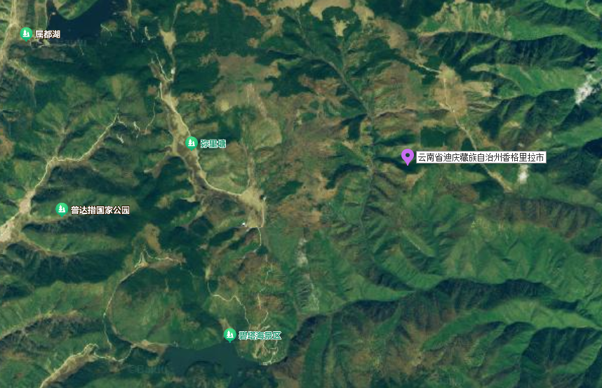 通过题目提供的经纬度,我在卫星地形图上找到了震中地点的坐标,位于【云南省迪庆藏族自治州香格里拉市】范围内,看地形图应该是在山林中,一个犄角旮旯里。震中的西边是几个风景区,诸如【弥里塘】、【属都湖】、【碧塔海景区】、【普达措国家公园】。