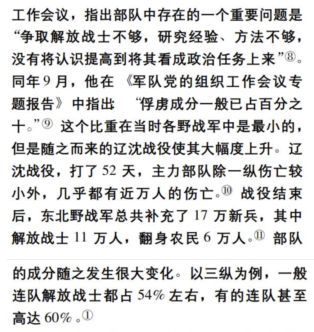 但就是辽沈战役后,东北野战军的部队成分发生的巨大转变,“战役结束后,东北野战军总共补充了17万新兵,其中解放战士11万人,翻身农民6万人。⑪部队的成分随之发生很大变化。以三纵为例,一般连队解放战士都占54%左右,有的连队甚至高达60%。①”