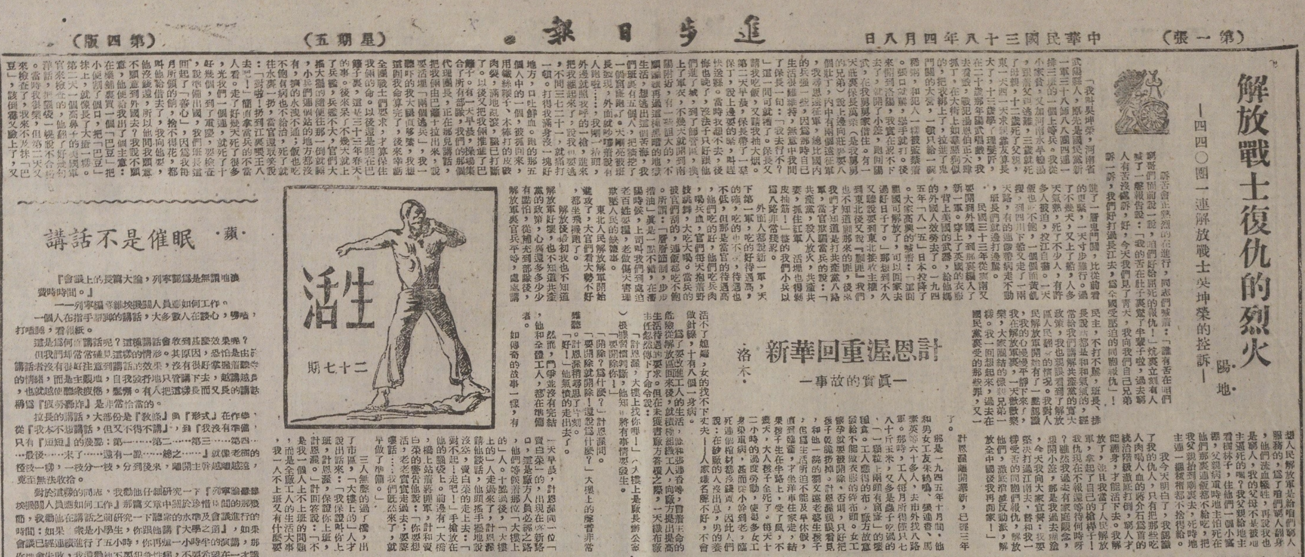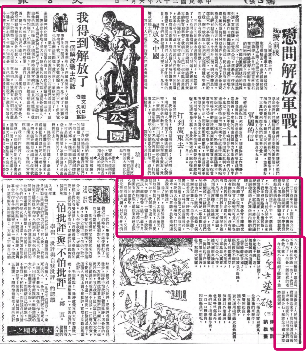 今天我不但得到了解放,而且還參训了人民解放軍。上級問 我願意回家不?我的仇還沒有報,戌是不回家的,只有完全打倒 匪首蔣介石,解放全中國能談起回家。