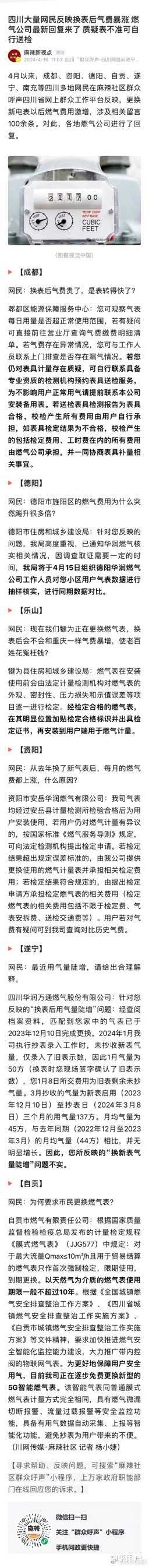 于是官方回复来了,重庆燃气4月10日发布公告表示,针对市民关于燃气计量问题,将开通燃气计量免费复核服务快速通道。提供抄表账期、抄表读数、气价、缴费时间及金额等24小时在线查询。安排专业人员为客户免费提供燃气计量上门复核服务,对气表运行状况和用气安全进行检查,对抄表读数、抄表账期进行复核。