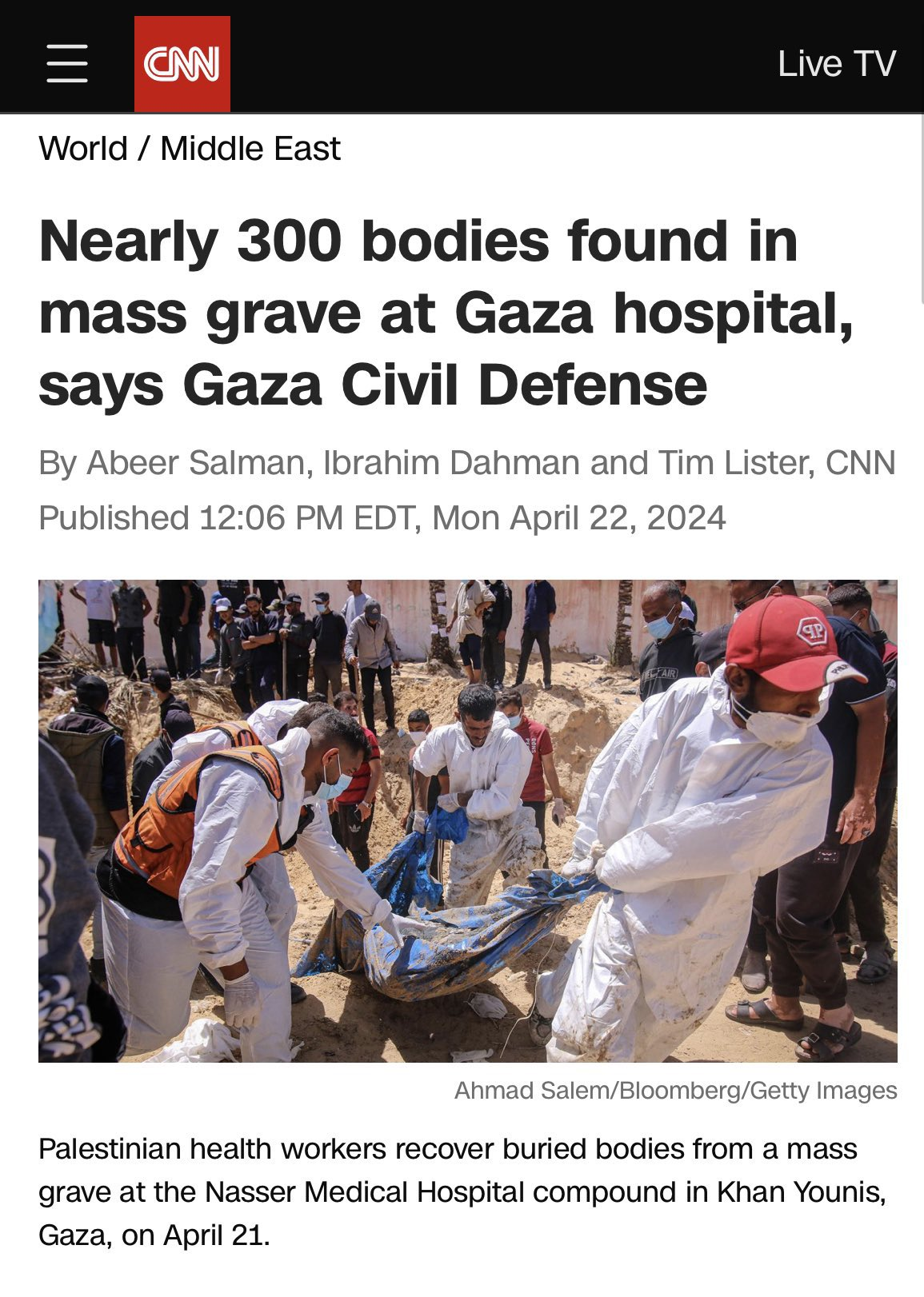 在这篇文章最后部分,CNN表示还有400人下落不明,加沙民防人员和救援人员正在加班加点努力对现场进行挖掘。以色列国防军表示他们运走了几十具尸体,将会在以色列境内做DNA检测,然后再交还。
