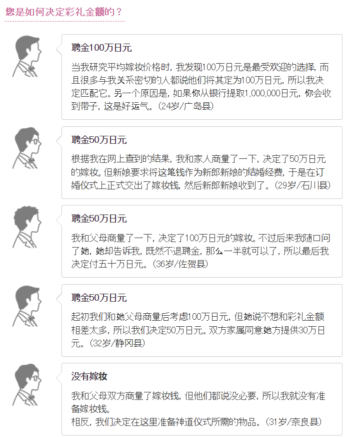 日本彩礼大概在100万日元,相当于5万人民币左右。日本皇室昭和天皇弟弟的孙女,绚子公主出嫁时,据说結納金也只有300万日元,折合人民币14万元左右。女方收到“结纳金”后,还要再返还男方10%-50%当做回礼。